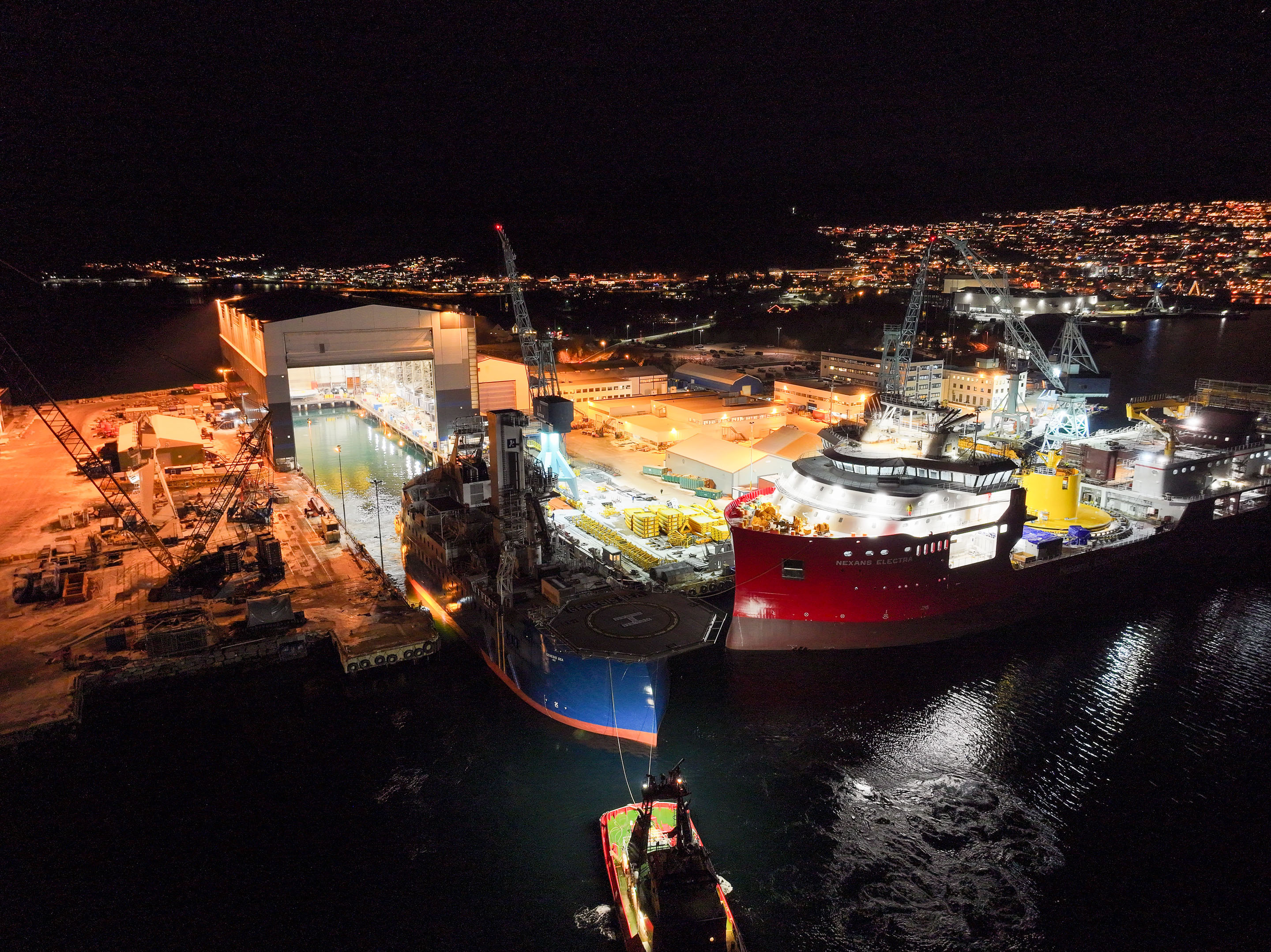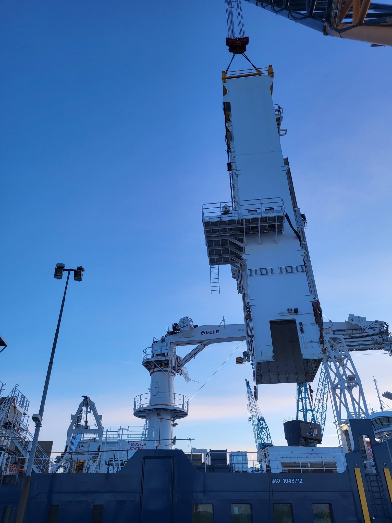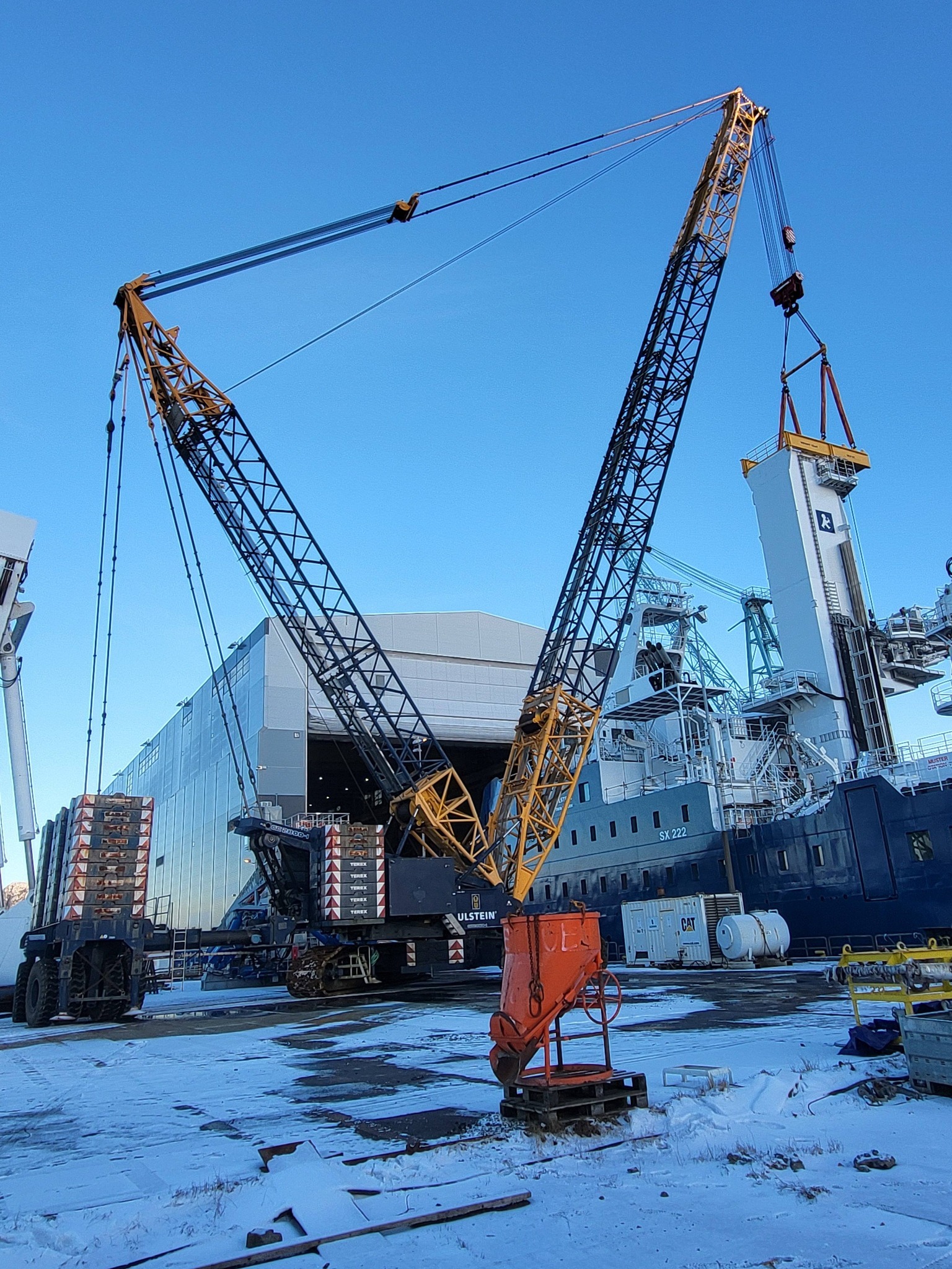 On 2 January, yard number 322, a commissioning service operation vessel (CSOV), was towed out from the dock hall to the outer dock. The yard's heavy-lift department mounted the tower on the newbuild using its powerful crawler crane, with a lifting capacity of up to 600 tonnes. On 7 January, the vessel was towed further out to sea and moored alongside the quay. At the same time, the sister vessel, hull number 323, was docked in the dock hall for further work.