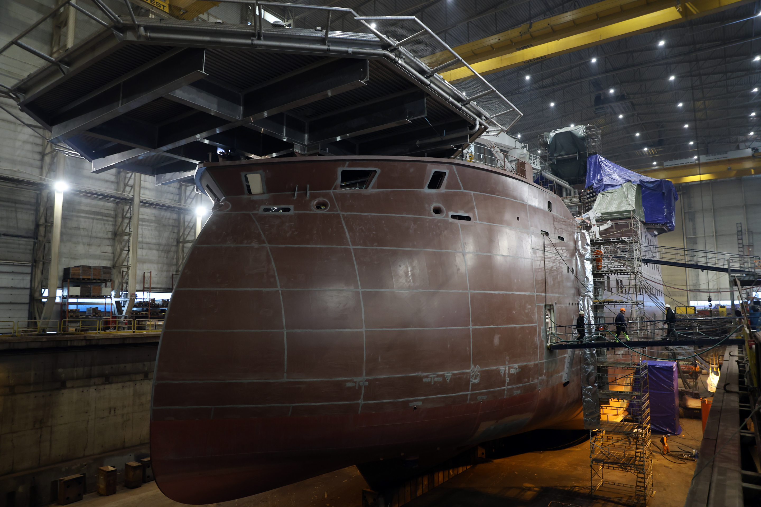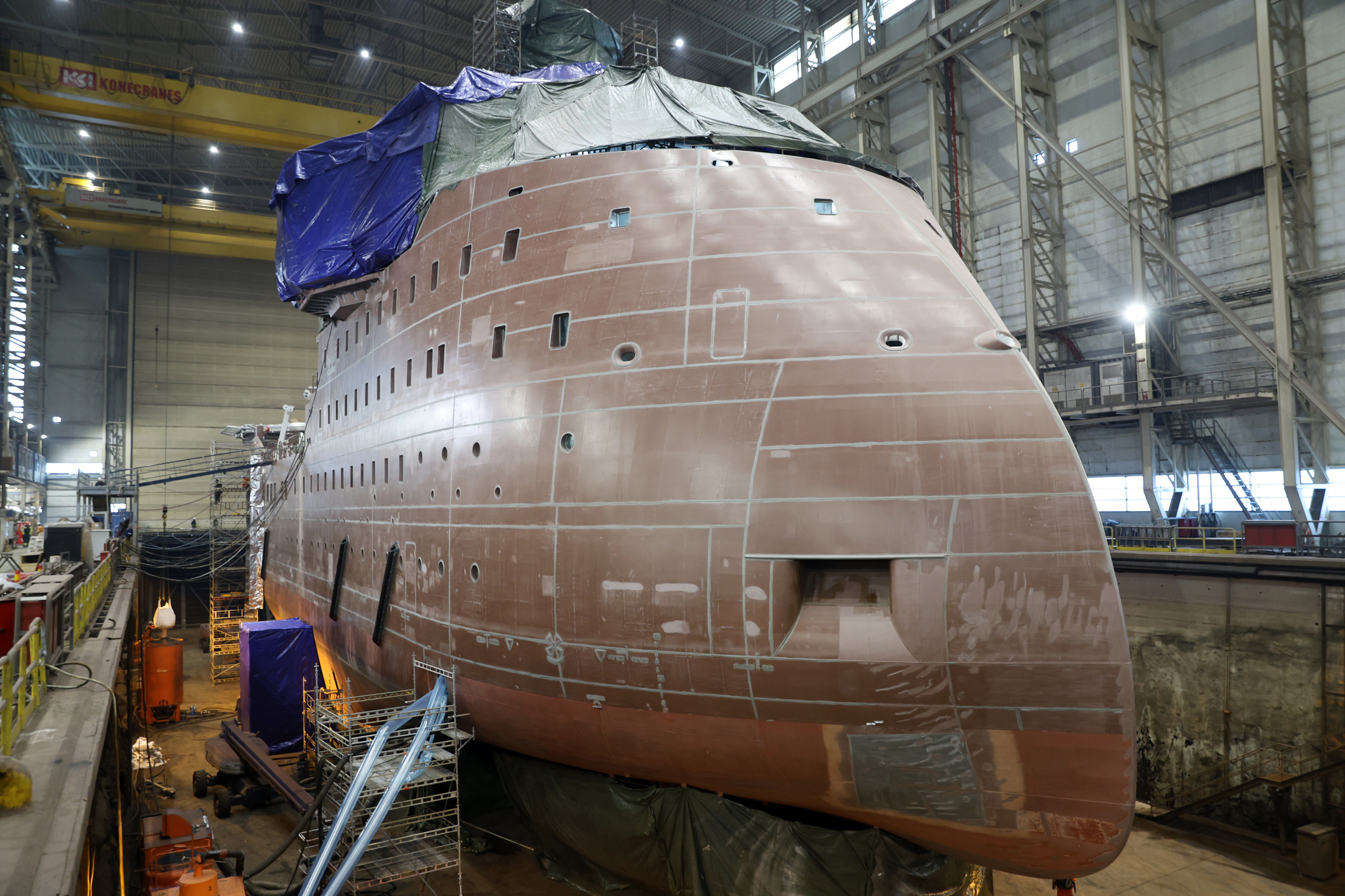 The vessel will remain in the dock hall throughout the painting process, with all exterior work scheduled for completion prior to the float-out in early 2026.